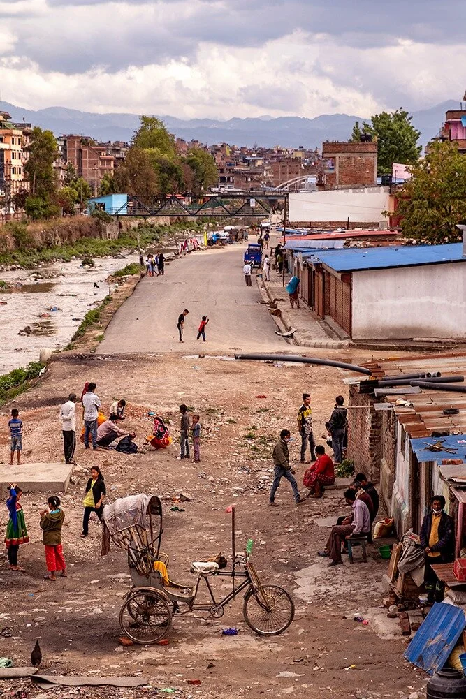 The first I see are the slums below the Bishnumati Bridge; a man squatted on a platform by the river cuts his son's hair while the family circles them; the elders sit on benches near an abandoned rickshaw cart. Children play with balls and chickens. Nobody wears a mask. “The beloved river of Vishnu” is a landfill the government has commissioned to clean several times, but no-one, not even the police patrolling the bridge above in opened trucks, notices the Dalit, the untouchable, living in rooms made of uralite sheets. The river acts as a thin boundary between the quarantined families to the left and people socially isolated for years to the right.